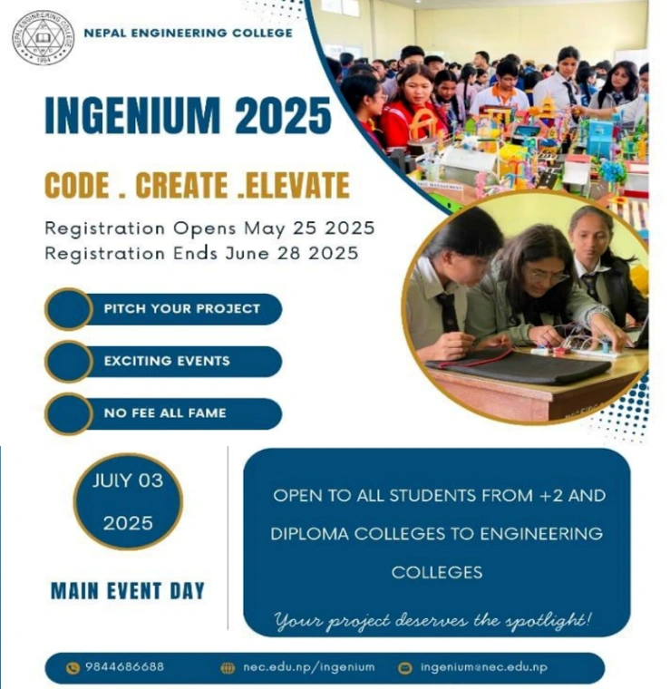 Join INGENIUM 2025 at Nepal Engineering College! Showcase your innovative projects in science and engineering. Open to +2, Diploma, and Engineering students. Win exciting opportunities!