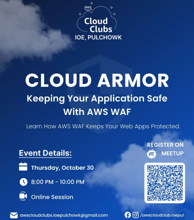 Join AWS Cloud Clubs – IOE, Pulchowk for an online knowledge session titled “Cloud Armor: Keeping Your Applications Safe with AWS WAF”.