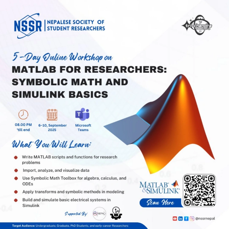 Join a 5-day free online workshop on MATLAB for Researchers by NSSR, TCRG, and QNepal. Enhance your skills in data handling, symbolic mathematics, and Simulink basics. Register now!
