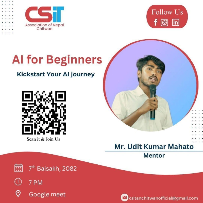Kickstart your AI journey with CSIT Association of Nepal - Chitwan! Join our virtual event, "AI for Beginners," and explore the basics of AI with mentor Mr. Udit Kumar Mahato. Build your foundation and discover the future scope of AI.