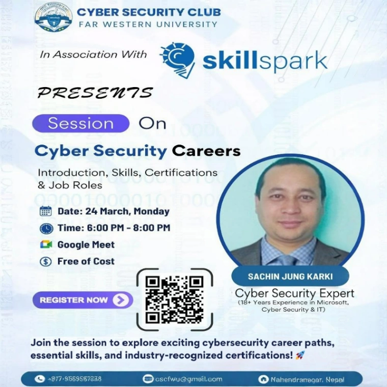 Join the Cyber Security Career Session hosted by The Cyber Security Club - Far Western University and SkillSpark! Explore career paths, essential skills, and certifications. Don't miss out!