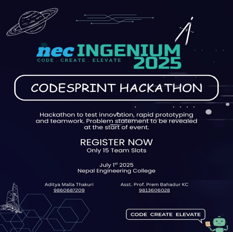 Join the CodeSprint Hackathon for a test of innovation and teamwork! Solve real-life challenges using code at Nepal Engineering College. Part of nec Ingenium 2025.