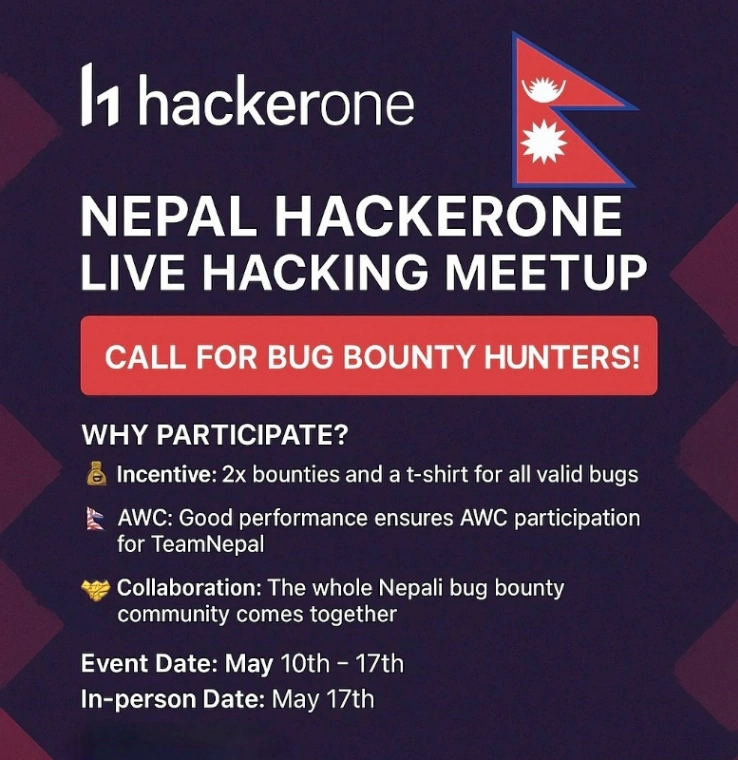 Nepal’s first-ever HackerOne Live Hacking Meetup is here! Hunt bugs, earn double bounties, score exclusive swag, and connect with top security minds—online and in-person. Don’t miss out!