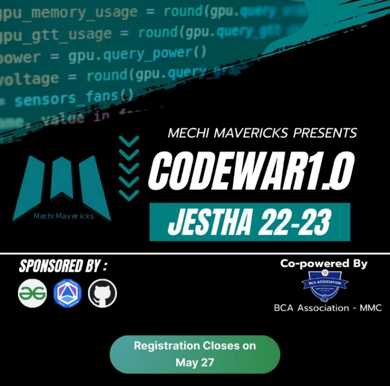 Participate in CodeWar 1.0, a competitive coding event by Mechi Mavericks, and test your problem-solving skills in a dynamic, competitive environment. Win prizes and recognition!