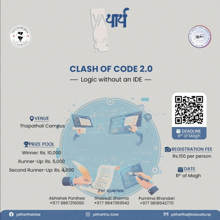 Chaos Debug is a competitive debugging event at Yathartha 2082. Teams identify and fix buggy programs under time pressure. Open to +2 and Bachelor’s students.