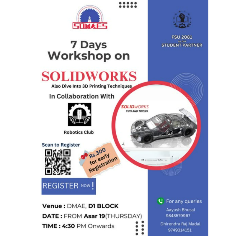 Join SOMAES and the Robotics Club for a 7-day SolidWorks Fellowship! Dive into modeling, design, 3D printing, and gain valuable experience. Limited spots available, apply now!