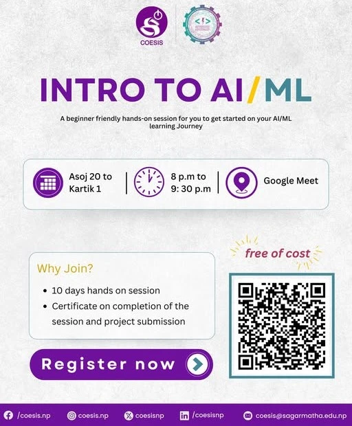 Join COESIS & SEIS for a 10-day free AI/ML training program! Perfect for beginners, gain hands-on experience with Python, ML, and DL. Build a mini AI/ML project and boost your skills!