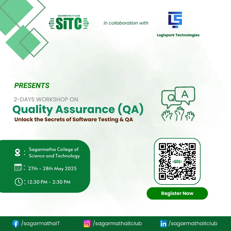 Unlock the secrets of software testing & QA. Join Sagarmatha IT Club & Logispark Technology for a 2-day workshop. Enhance your QA skills with hands-on experience!