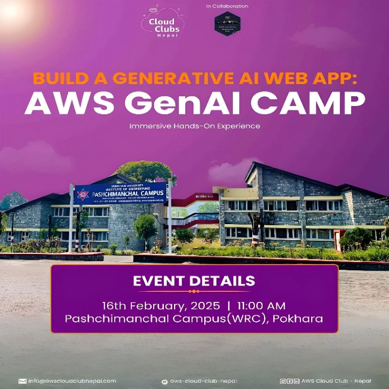 Join the AWS UG Women in Tech Meetup & GenAI Bootcamp in Pokhara! Explore cloud computing, AWS, DevOps, and AI/ML. Hands-on sessions, expert talks, and networking await!