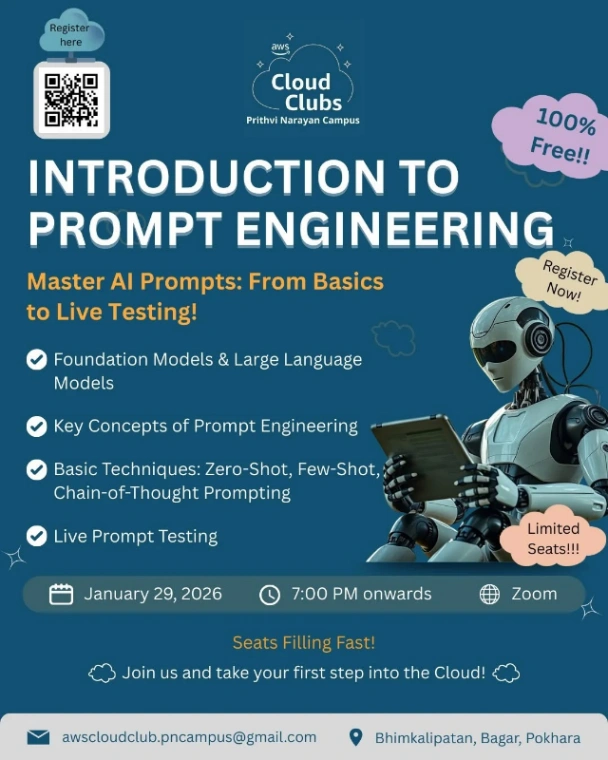 Join AWS Cloud Club @ PNC for a free, online session on Prompt Engineering. Learn how Large Language Models work, master prompting techniques, and test them live.