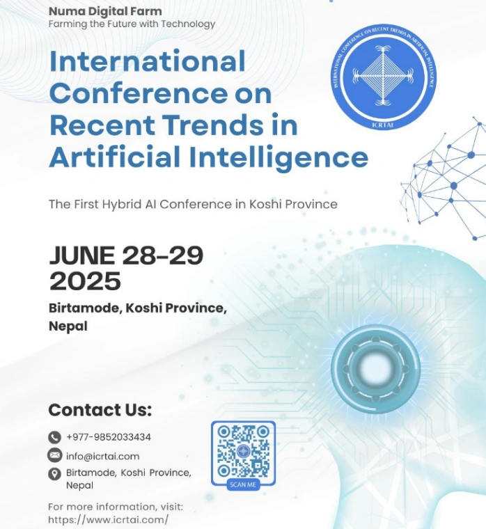 Join Nepal's first hybrid AI conference, ICRTAI 2025, focusing on AI applications in Agriculture, Healthcare, and Fintech. Network with global experts and shape Nepal's digital future! 🚀