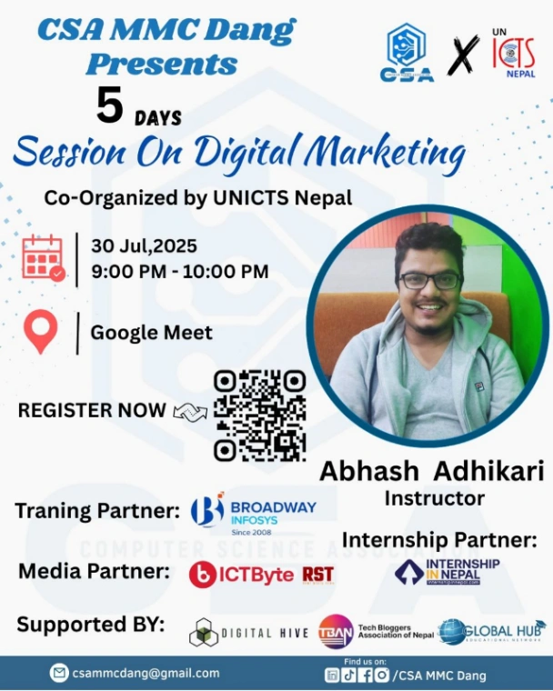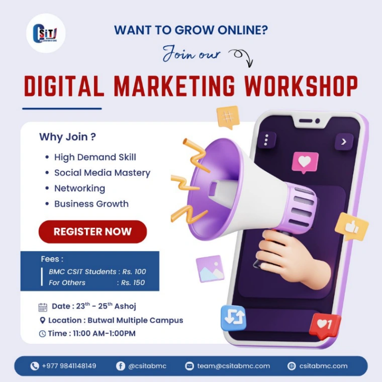 Join a 3-day Digital Marketing Workshop organized by CSIT Association of Butwal Multiple Campus. Learn hands-on strategies to boost your skills and online presence.