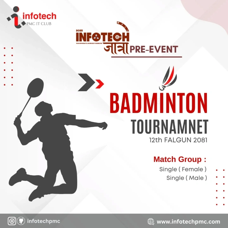 Infotech PMC IT Club presents the Infotech Badminton Tournament at Patan Multiple Campus. A singles tournament offering a chance to showcase your skills and compete for glory. 🚀🏸