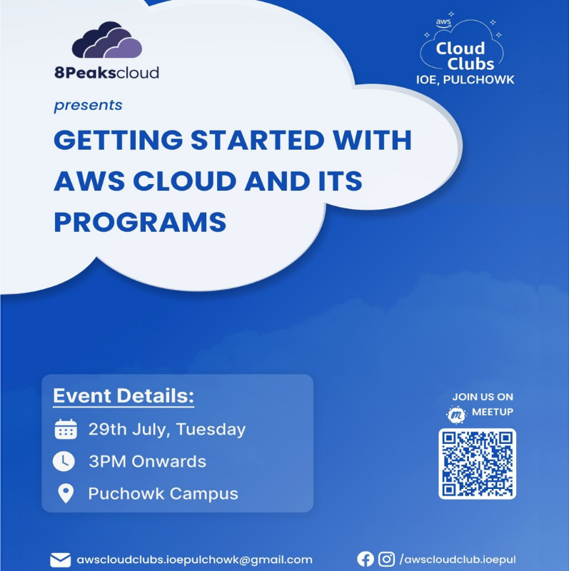 Kickstart your cloud journey with AWS Cloud Clubs - IOE Pulchowk! Learn AWS fundamentals, explore global programs, connect with experts, access learning resources, and grow your skills !