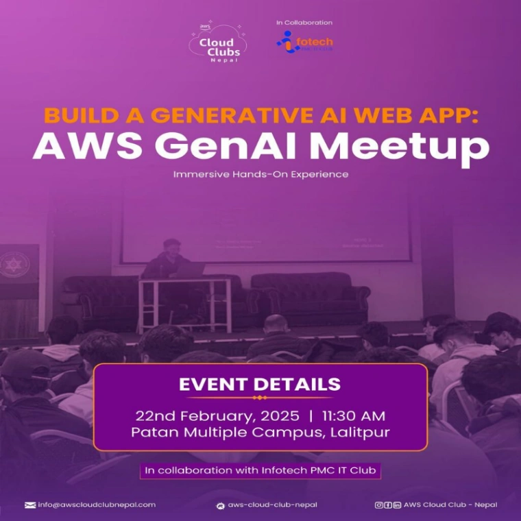Explore Generative AI at the AWS GenAI CAMP! Get hands-on experience building cutting-edge web applications using AWS technologies. Join us at Patan Multiple Campus!